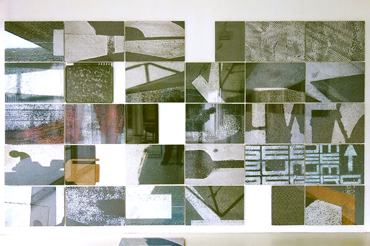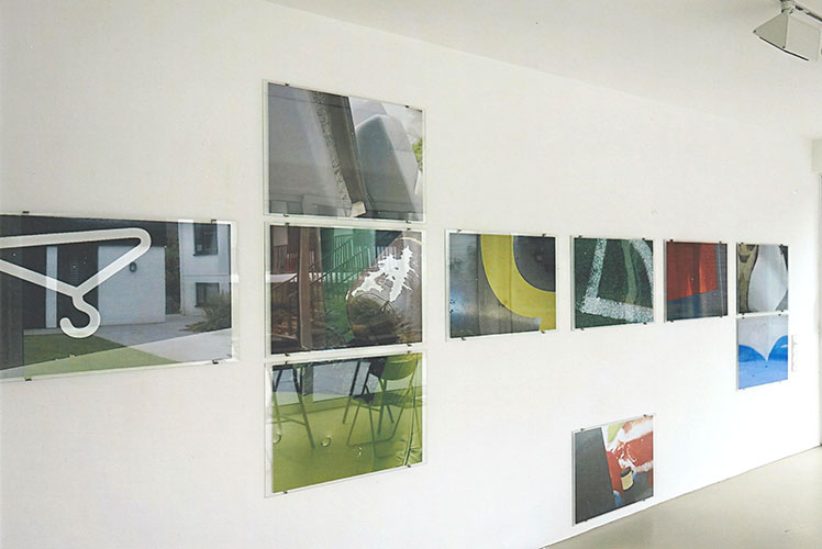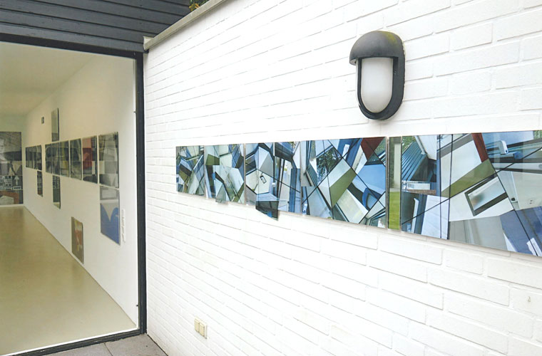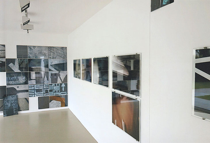 Die Arbeit H-18 im Außenbereich zwischen der Halle und dem Wohnhaus ist ein sinnfälliges Beispiel für dieses Erkunden. Die Wirklichkeit des eigenen Standorts wird zur Bildwirklichkeit. Die Photographie reduziert hier die Architektur des Ortes auf ihre wesentlichen Bestandteile aus Linien und Flächen, das freie Demontieren und Montieren in den Collagen und die Vernetzung der Reihe durch gezeichnete Linien auf dem Glas kippen und verkanten den Raum zu einem dynamischen Kaleidoskop. Dabei greifen Teile der Photos außerhalb der Rahmung in den Ort selbst ein und irritieren damit die Illusion des Abbilds genauso, wie die Spiegelung des Betrachters in der Verglasung der Arbeiten und im eingefügten schmalen Spiegelteil .