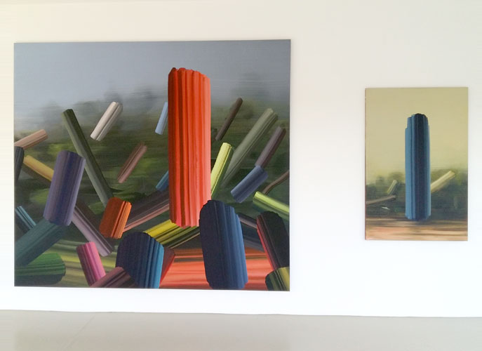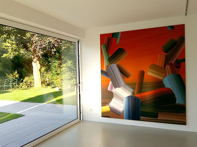 …… es war noch im letzten Jahrhundert, als wir uns bei einer Grillfeier für die Kursteilnehmer der Sommerakademie Wismar kennenlernten und redeten: über Kunsthandwerk in der DDR, über Essen in Frankreich, später auch über Musik und Architektur und dann auch ‚über Malerei‘. Diese Titelwahl für die Ausstellung umfasst des Künstlers Wirken perfekt. Denn aus der Reflexion über Malerei resultiert die Umsetzung von Erinnerung an Landschaften, an Musik, an Fotomotive, auch an die Bildsprache alter Meister in ein neues Konzept, in eine neue Form, und das in einer überwältigenden Farbigkeit. Die Körper, die man zu sehen glaubt, möchte man ertasten und mag kaum glauben, dass die Setzung der Farbpigmente allein für diese Räume verantwortlich ist.